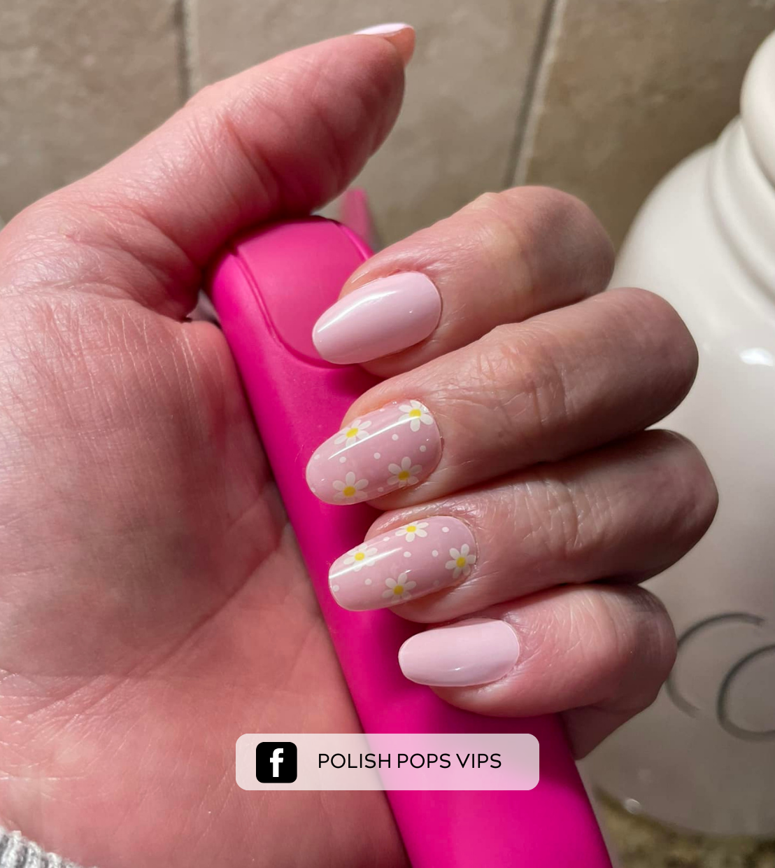 I love this pink and the little flowers are cute. They have a yellow center, so I'm thinking of searching for solid yellows to combine the print with. As of this review they have been on for two weeks and still going strong. Tip: When I remove my mani I lift at the edge with a stick and use nail polish remover with a flat brush. I work it back and forth under the sticker and it works well for quickly breaking down the adhesive.