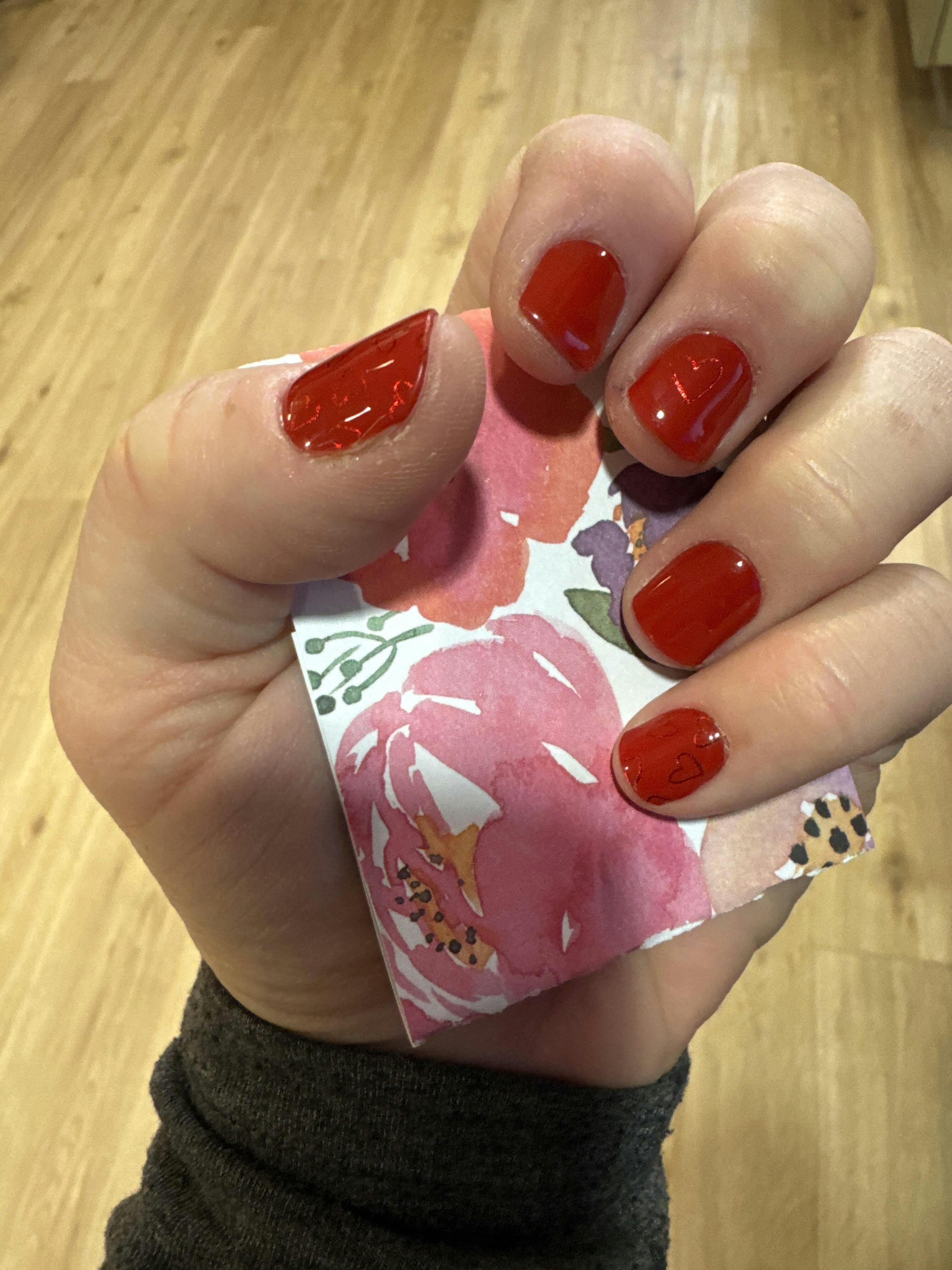 Fall head over heels for this adorable gel strip set featuring red foil hearts scattered across a red base. Perfect for subtly expressing your romantic side with instant glamour and charm. Easy to apply, long-lasting, and undeniably cute.