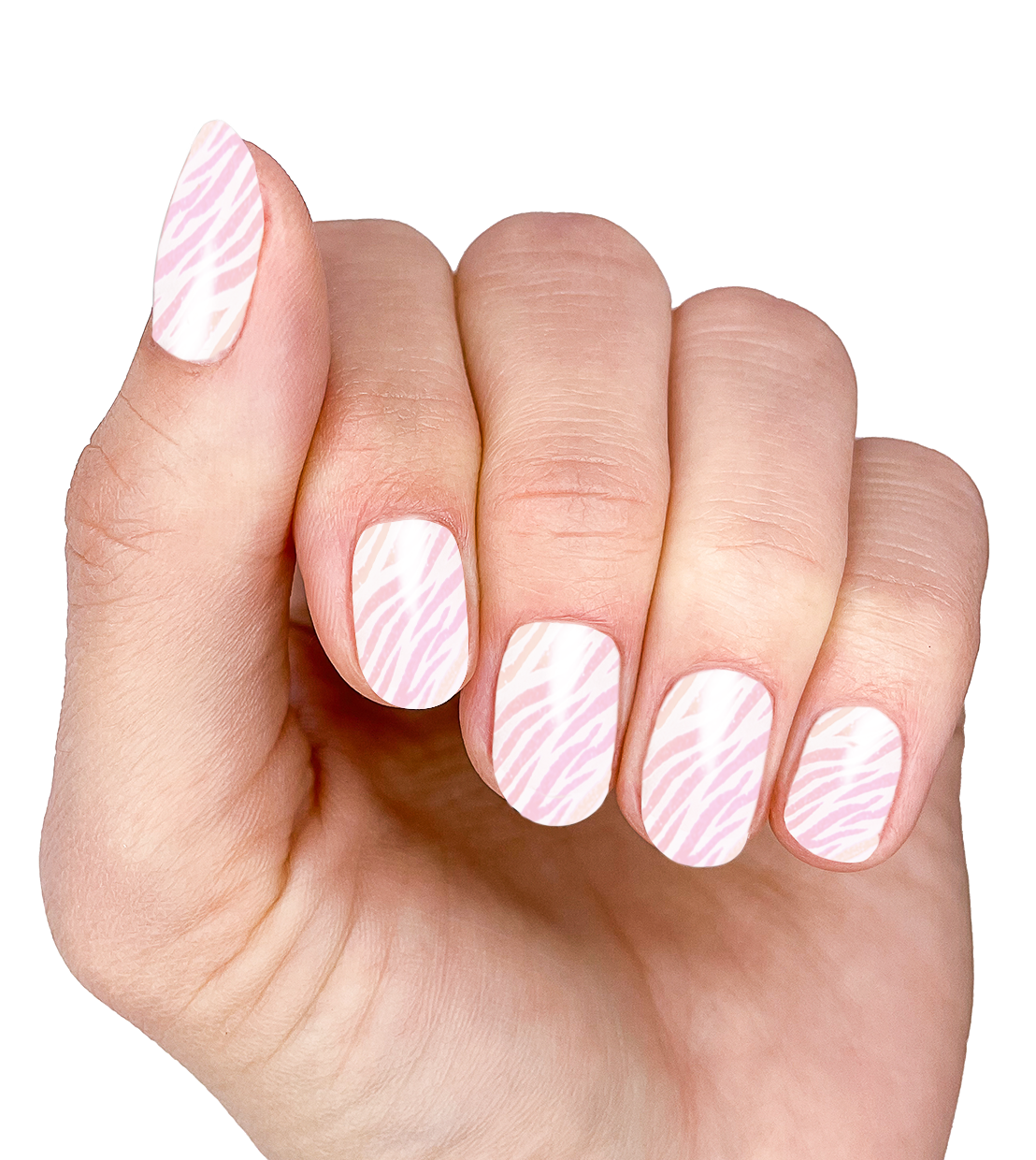This muted pink and peach ombre zebra print over a white base nail polish wrap will leave you feeling so on trend.