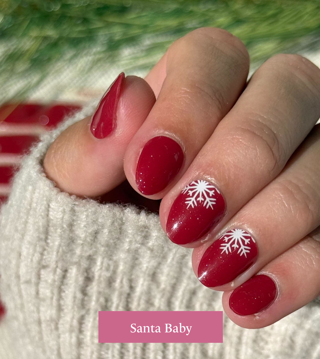 Santa Baby is a terrific color. Unique shade of a pink-ish red with a brilliant sparkle. Perfect for the December holidays but also just for winter in general. I purchased so many beautiful holiday sets. I wanted time for each of them to shine and this is perfect for the winter season with the darker color and snowflakes accents. I waited until early January to apply this one. Not only is the color incredible, what amazes me about this set (and all the sets I have tried thus far) is how strong they make my nails! I am so hard on my hands (cooking, dishes, cleaning, other manual heavy lifting around the house and work). Though my nails are relatively strong to start with I am always breaking them. What would have normally resulted in a bad, deep break on my thumb nail while I was working on a home clean up project this set protected my nail so well, it was just a simple snag/ chip on my pop and nail. I was easily able to file down and get extended wear on this set. I would most definitely purchase again if this one returns!