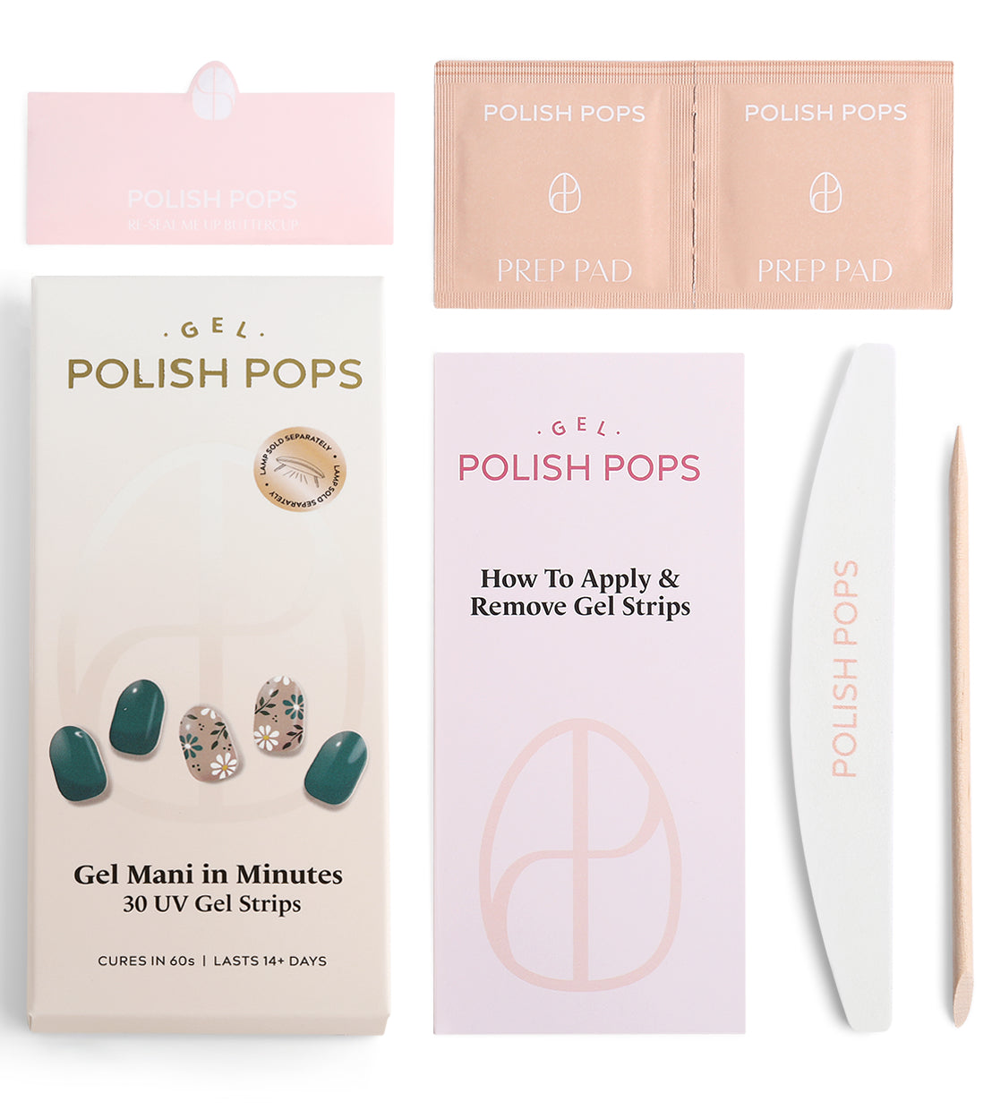Get a picture perfect manicure in minutes with Polish Pops! Application is easy, just peel, press, cure, and admire!