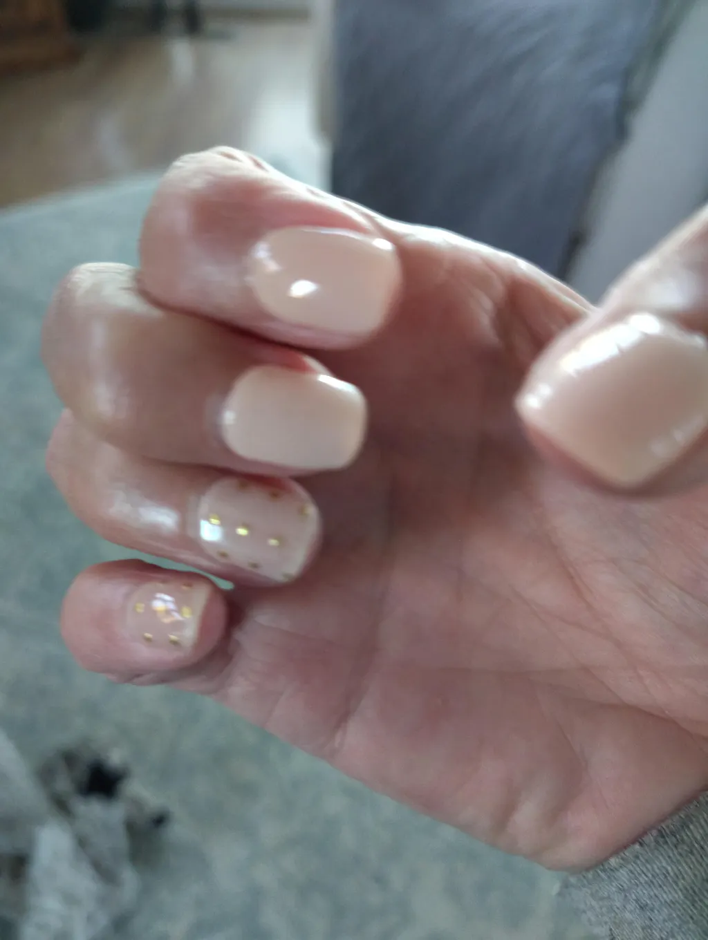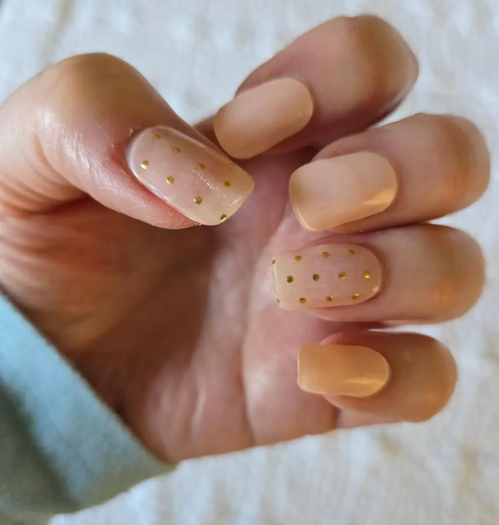 I’ve been using Polish Pops for over a year now and can’t get enough! Awesome quality as always. Easy to apply. This one has beautiful gold accent nails that are still neutral enough to go with everything. The solid to me is a very pale peach pink.